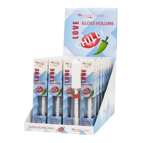 Gloss labial Chilli Volume da Max Love. Proporciona brilho aos lábios e efeito volumoso. Fórmula com vitamina E, D-pantenol e ácido hialurônico. Ideal para usar sozinho ou por cima do batom.