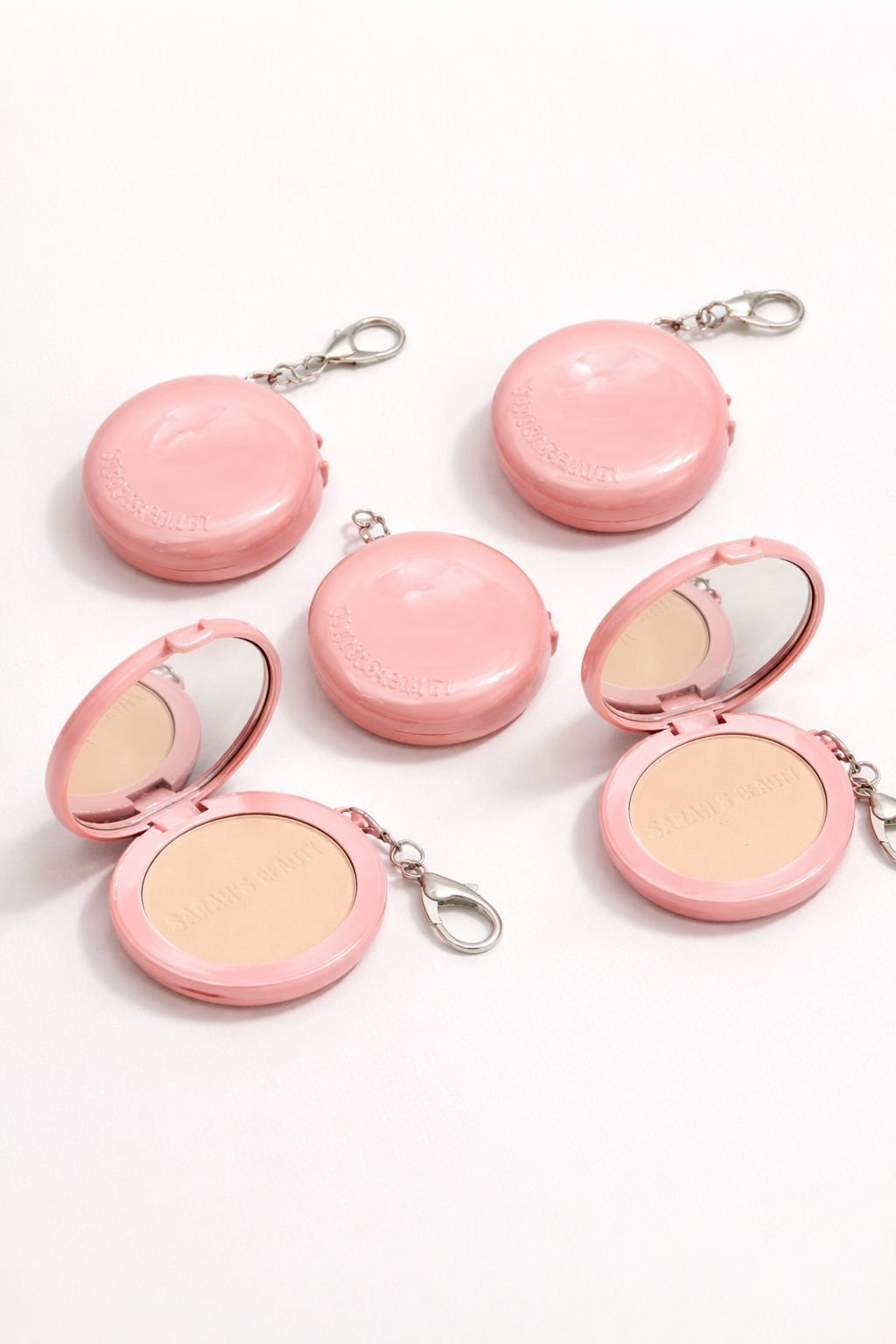 Pó compacto com espelho e chaveiro, ideal para levar na bolsa e fazer retoques a qualquer momento. Possui embalagem prática e charmosa.